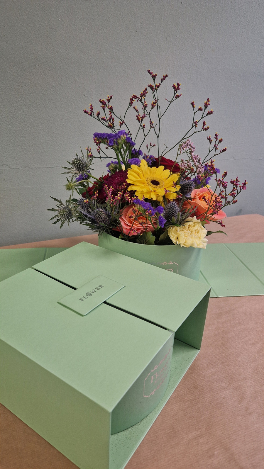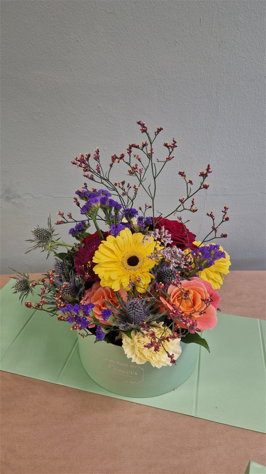 A keepsake, not just a flower delivery, but a Vibrant hat box to keep, set in heavy quality Card, lime green in Colour, filled with flowers full of colour pops.